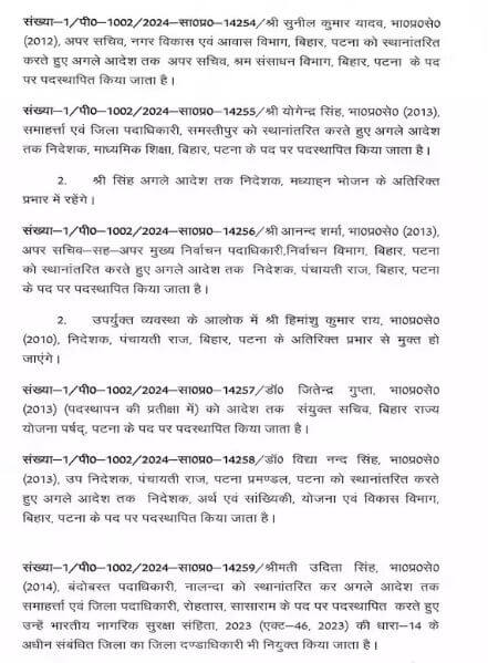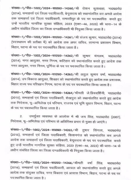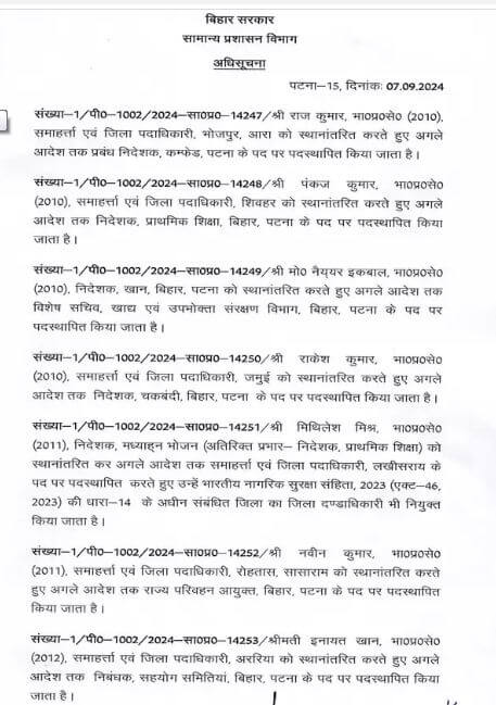 जारी अधिसूचना के अनुसार, भोजपुर, शिवहर, जमुई, लखीसराय, रोहतास, अररिया, समस्तीपुर, बेगूसराय, शेखपुरा, किशनगंज, अरवल, मधेपुरा सहित 12 जिलों के डीएम को बदले गए है। वही चार जिलों पटना, मोतिहारी, शिवहर और गया में नये उप विकास आयुक्त (डीडीसी) और तीन नगर निगम कटिहार, पूर्णिया और गया में नगर आयुक्त के तबादले किए गए है।