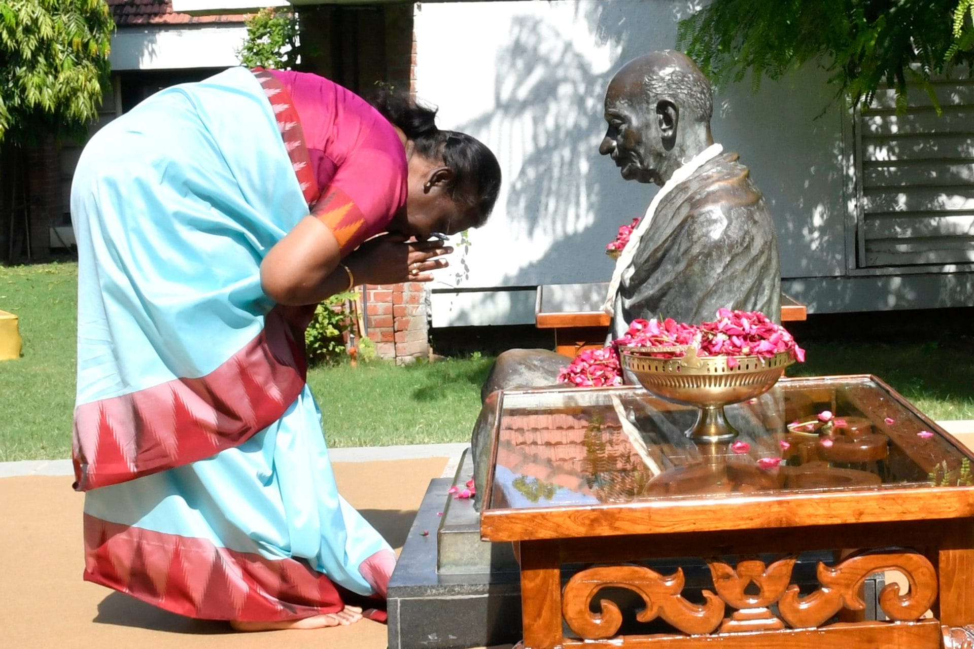 गांधीनगर, डेस्क रिपोर्ट | देश की महामहिम राष्ट्रपति द्रौपदी मुर्मू गुजरात की साबरमती में महात्मा गांधी के आश्रम पहुंची। इस दौरान उन्होंने गांधी जी के आश्रम में चरखा भी चलाया। जिसके बाद महात्मा गांधी की प्रतिमा पर पुष्प अर्पित कर उन्हें श्रद्धांजलि दी। केवल इतना ही नहीं उन्होंने राष्ट्रपिता के संपूर्ण जीवन काल और उनके स्वतंत्रता संग्राम को दर्शाने वाली प्रदर्शनी को देखा। साथ ही आश्रम पूर्ण विकास परियोजनाओं के मॉडल का निरीक्षण किया। जिसके बाद वह राष्ट्रपिता के आवाज हृदय कुंज पहुंची। इस पूरे कार्यक्रम के दौरान प्रदेश के मुख्यमंत्री भूपेंद्र पटेल भी मौजूद रहे। बता दें कि राष्ट्रपति बनने के बाद यह उनका पहला दौरा है।