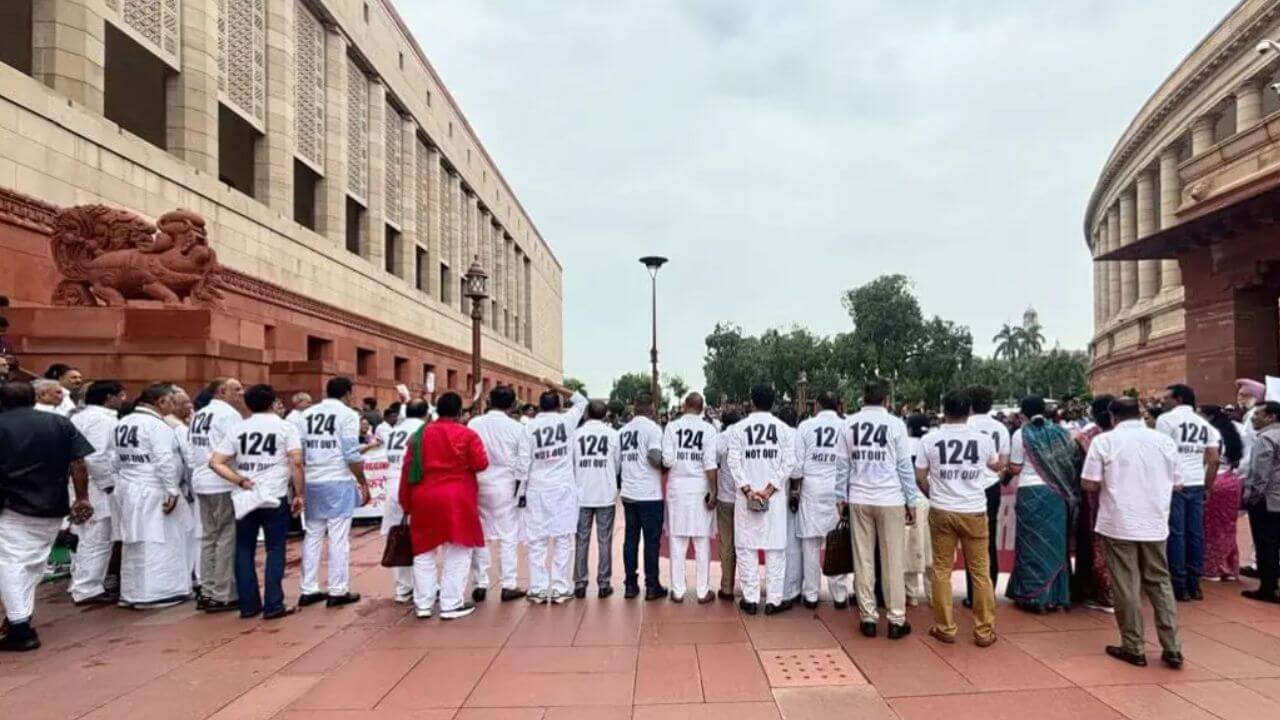 इंडिया गठबंधन के सांसदों ने मंगलवार को संसद परिसर में बिहार में चुनाव आयोग की मतदाता सूची संशोधन के खिलाफ प्रदर्शन किया। कांग्रेस अध्यक्ष मल्लिकार्जुन खड़गे, सोनिया गांधी, प्रियंका गांधी वाड्रा, टीएमसी के डेरेक ओ’ब्रायन, डीएमके के टीआर बालू और एनसीपी (एसपी) की सुप्रिया सुले सहित कई सांसदों ने ‘124 नॉट आउट‘ लिखी सफेद टी-शर्ट पहनकर विरोध जताया। उनके बैनरों पर ‘हमारा वोट, हमारा अधिकार, हमारी लड़ाई‘ और ‘एसआईआर – साइलेंट इनविजिबल रिगिंग‘ जैसे नारे लिखे थे।