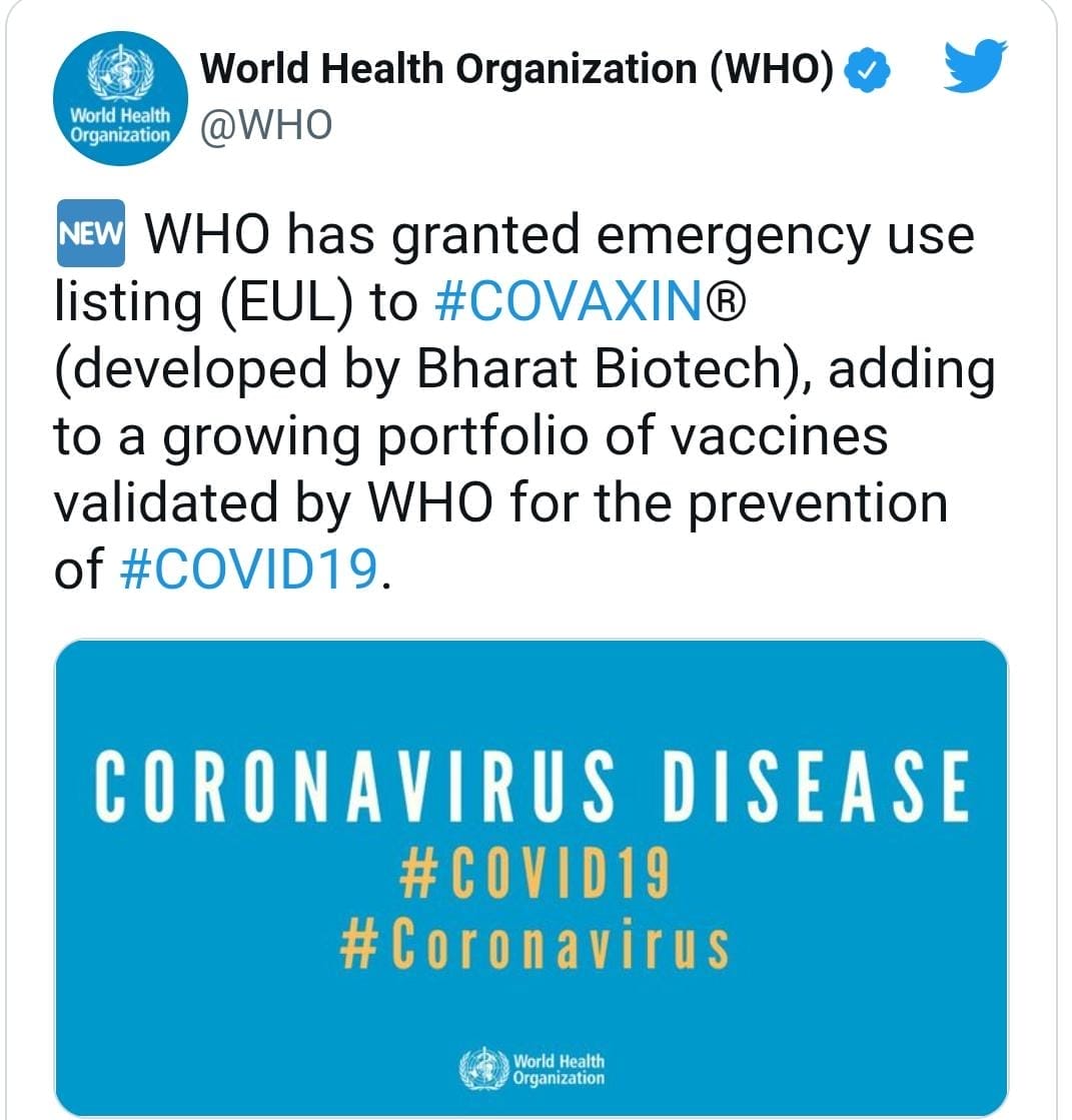 दिल्ली, डेस्क रिपोर्ट। भारत की स्वदेशी वैक्सीन भारत बायोटेक के कोवैक्सिन को विश्व स्वास्थ्य संगठन की ओर से बड़ी सफलता मिली है. WHO ने कोवैक्सिन को अपनी इमरजेंसी यूज लिस्टिंग में शामिल कर लिया है, जिसके बाद कोवैक्सीन को WHO की तरफ से इमरजेंसी इस्तेमाल की मंजूरी मिल गई है।