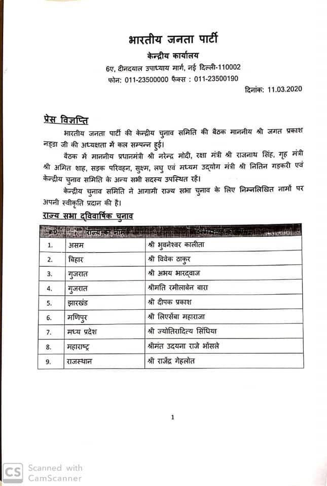 बताते चलें कि वहीं देशभर से राज्यसभा की 55 सीटों के लिए 26 मार्च को चुनाव होने हैं। जिनमें से भाजपा की तरफ से इन लोगों को राज्यसभा चुनाव का टिकट दिया गया है। जिनमें असम से भुवनेश्वर कालिता, गुजरात से अभय भारद्वाज, गुजरात से रमिलाबेन बारा, झारखंड से दीपक प्रकाश, मणिपुर से लिएसेवा महाराजा, बिहार से विवेक ठाकुर, मध्यप्रदेश से ज्योतिरादित्य सिंधिया, महाराष्ट्र से उदयनराजे भोसले के साथ राजस्थान से राजेंद्र गहलोत को टिकट दिया गया है।