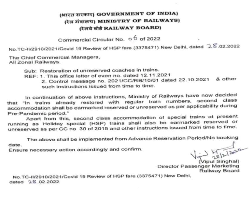 रेलवे मंत्रालय की तरफ से दिए गए आादेश में बताया गया कि ट्रेनों में अब जल्द ही अनारक्षित कोच लगने शुरू हो जाएंगे। पहले ट्रेनों में जिस तरह अनारक्षति कोच लगाए जाते थे, वह जल्द ही अब सभी ट्रेनों में लगने लगेंगे, इसका मतलब यह है कि अब आप बिना रिजर्वेशन के पहले की तरह जनरल बोगी (General Coach) में सफर कर सकेंगे। यात्रियों को अब जनरल टिकट (General Rail Ticket) लेने में भी कोई परेशानी नहीं होगी। इस तरह रेलवे (Indian Railway) ने ट्रेनों में जनरल डिब्बों (General Coach) की पुरानी व्यवस्था को बहाल करने का फैसला लिया है।