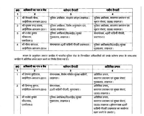 - राजेश कुमार श्रीवास्तव का सेनानायक 42वीं वाहिनी पीएसी प्रयागराज के पद पर तबादला किया गया है। राजेश कुमार को कारागार प्रशासन और सुधार सेवाएं लखनऊ का भी अतिरिक्त प्रभार सौंपा गया है।