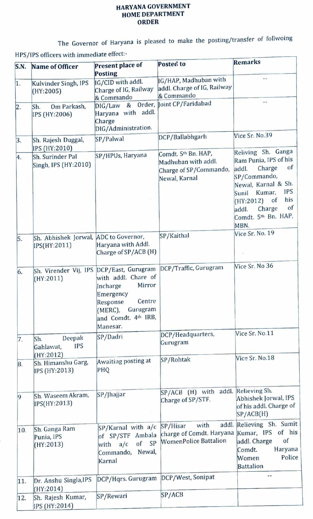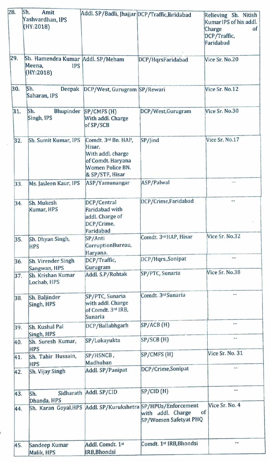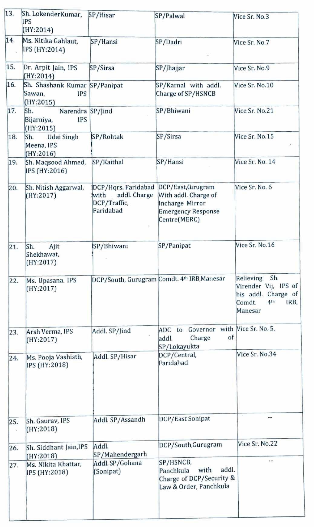 हरियाणा में हुए इन IPS-HPS अधिकारियों के तबादले