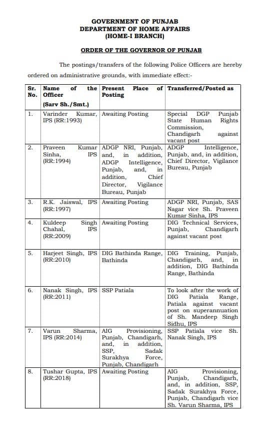 इन अफसरों में वरिंदर कुमार, प्रवीण कुमार, आर.के. जैसवाल, कुलदीप सिंह चहल, हरजीत सिंह, नानक सिंह, वरुण शर्मा, तुषार गुप्ता, मनिंदर सिंह, हरकमलप्रीत सिंह शामिल हैं। वहीं आईपीएस कुलदीप चहल को डीआईजी टेक्नीकल सर्विस पंजाब नियुक्त किया गया है।