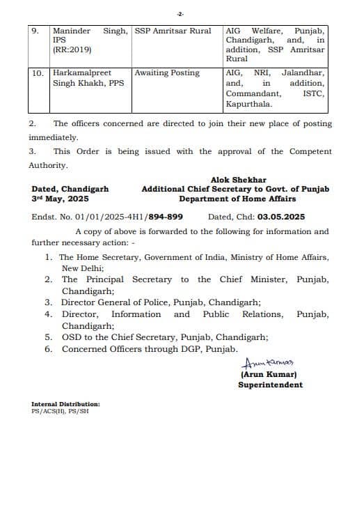 - पीपीएस अधिकारी हरकमलप्रीत सिंह खाख को एनआरआई जालंधर के साथ ही एडिशन कमांडेंट आईएसटीसी कपूरथला बनाया गया है।