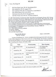 आनंद राय, एसपी जंगीपुर को स्थानांतरित करके सीओ, ईएफआर तीसरी बटालियन सलुआ के पद पर भेजा गया है। अंगशुमन शाह को नारायणी बटालियन कूच बेहार को स्थानंतरित करके को एसएसएफ बैरकपुर के सीओ पद पर नियुक्त किया गया। आईपीएस अधिकारी सूर्य प्रताप यादव, एसपी, मुर्शिदाबाद को भी उनके पद से हटा दिया गया है, उन्हें सीओ नारायणी कूच बेहार के पद पर नियुक्त किया गया है।