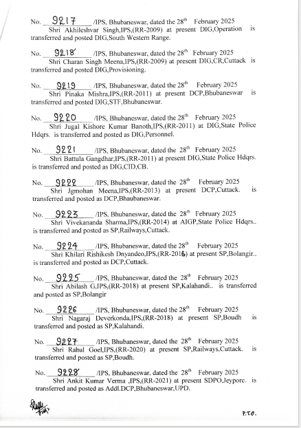 - एस. प्रवीण कुमार को केंद्रीय रेंज, कटक के लिए पुलिस महानिरीक्षक (आईजीपी) ।