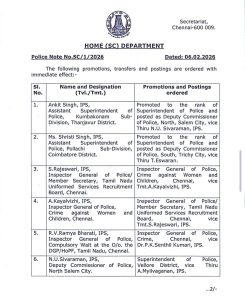 तमिलनाडु में अंकित सिंह, असिस्टेंट सुपरिंटेंडेंट ऑफ़ पुलिस, कुंबकोणम सब-डिवीजन तंजावुर जिला को प्रमोट करके डीसीपी, नॉर्थ, सालेम सिटी के पद पर नियुक्त किया गया है। सृष्टि सिंह को पदोन्नत करके डीसीपी, साउथ, त्रिची सिटी के पद पर पदस्थ किया गया है। आईपीएस अधिकारी एस राजेश्वरी को पुलिस महानिदेशक, महिलाओं और बच्चों के विरुद्ध अपराध, चेन्नई उपमहानिरीक्षक पद की जिम्मेदारी सौंपी गई है।