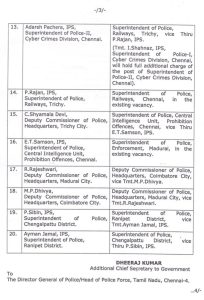 आदर्श पचेरा, पुलिस अधीक्षक-II, साइबर क्राइम डिवीजन को एसपी रेलवे त्रिची पद पर नियुक्त किया गया है। पी. राजन को एसपी, रेलवे, चेन्नई बनाया गया है। सी. श्यामला देवी को पुलिस अधीक्षक, केंद्रीय खुफिया इकाई, निषेध अपराध पद की जिम्मेदारी सौंपी गई है। ईटी सैमसन को प्रवर्तन पुलिस अधीक्षक पद पर पदस्थ किया गया है।