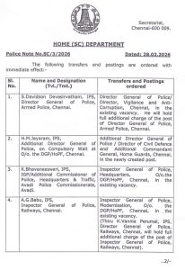आईपीएस अधिकारी एस डेविडसन देवसिरवाथम, पुलिस महानिदेशक, आर्म्ड पुलिस चेन्नई को डायरेक्टर जनरल ऑफ़ पुलिस या डायरेक्टर विजिलेंस एंड एंटी करप्शन चेन्नई पद की जिम्मेदारी सौंपी गई है। एच.एम जयराम को एडिशनल डायरेक्टर जनरल ऑफ पुलिस/डायरेक्टर ऑफ़ सिविल डिफेंस एंड एडिशनल कमांडेंट जनरल होमगार्ड चेन्नई पद पर नियुक्त किया गया है। के. भवानियेश्वरी को इंस्पेक्टर जनरल ऑफ़ पुलिस, हेडक्वाटर्स पद पर तैनात किया है। एजी बाबू को एडिशनल जनरल ऑफ पुलिस मॉडर्नाइजेशन बनाया गया है।