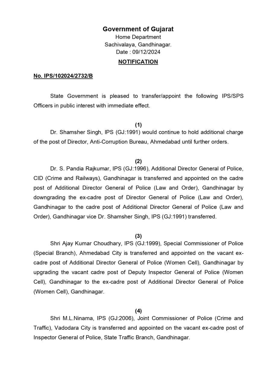 गृह विभाग की ओर से आदेश जारी कर दिया गया है।इसमें वडोदरा के अपराध और यातायात संयुक्त पुलिस आयुक्त एमएल निनामा को पुलिस महानिरीक्षक राज्य यातायात शाखा गांधीनगर के रूप में तैनात किया गया है।
