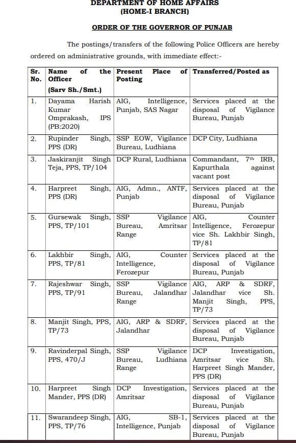 पंजाब की भगवंत मान सरकार ने भी पुलिस के विजिलेंस विभाग में बड़ा फेरबदल किया है । राज्य सरकार ने 16 आईपीएस और पीपीएस अफसरों के तबादले किए है।लिस्ट के मुताबिक,6 SSP , 2 IPS और 6 पीपीएस अफसरों के ट्रांसफर किए गए है। जिन अधिकारियों के तबादले हुए हैं, उनमें आईपीएस. अधिकारी दयामा हरीश कुमार, अरविंद मीणा का नाम शामिल है। रूपिंदर सिंह को DCP सिटी लुधियाना तैनात किया गया है।