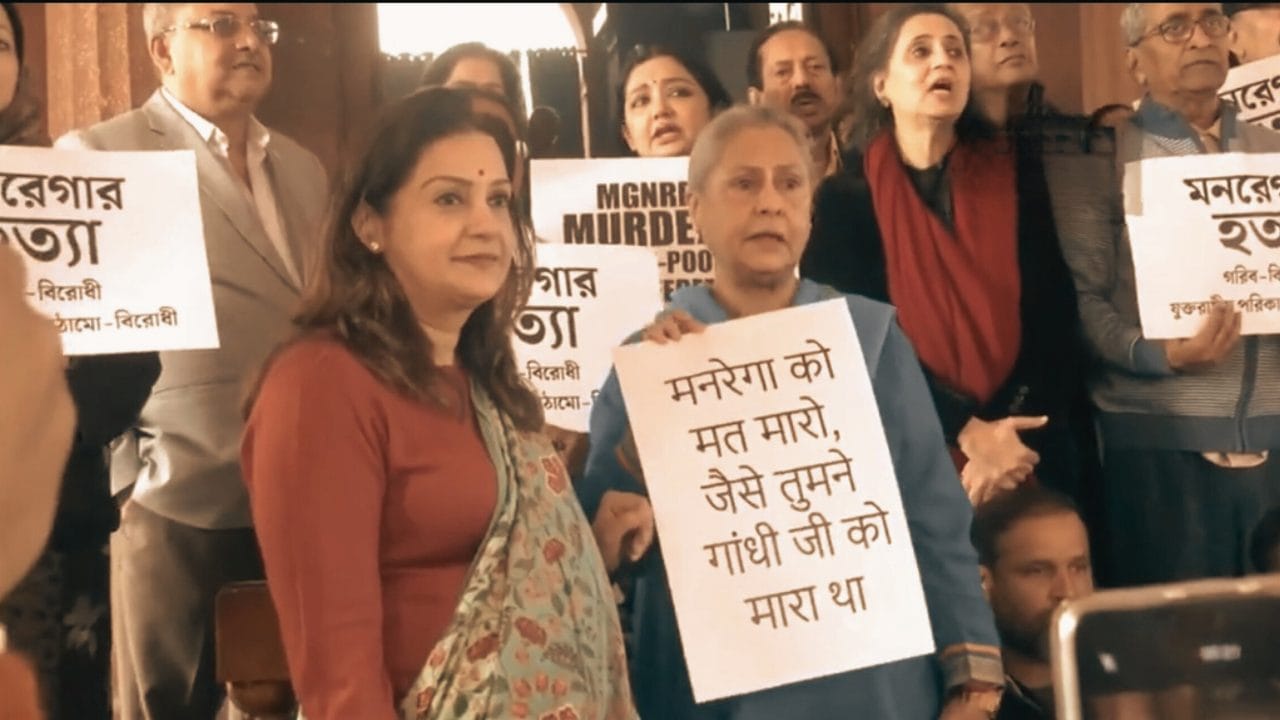 संसद शीतकालीन सत्र के आखिरी दिन विपक्षी सांसदों ने “विकसित भारत–गारंटी फॉर रोजगार एंड आजीविका मिशन (ग्रामीण) बिल 2025″ के विरोध में तृणमृल कांग्रेस के सांसदों के साथ मिलकर विरोध प्रदर्शन किया। इस विरोध में राज्यसभा सांसद जया बच्चन भी शामिल हुईं। बता दें कि TMC सांसदों ने इस बिल के खिलाफ गुरुवार रातभर 12 घंटे का धरना दिया था।