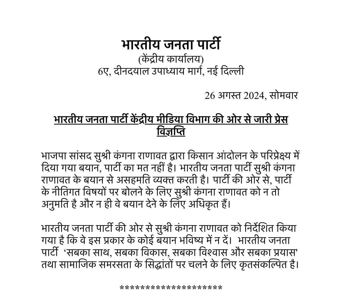 बता दें कि भारतीय जनता पार्टी की तरफ से प्रेस नोट जारी करते हुए यह साफ कर दिया गया है कि कंगना रनौत द्वारा किसान आंदोलन को लेकर दिए गए बयान पर पार्टी का मत नहीं है। पार्टी की ओर से नीतिगत विषयों पर बोलने के लिए अभिनेत्री को अनुमति नहीं है और ना ही इस बयान के लिए वह अधिकृत है। साथ ही अभिनेत्री को सख्त हिदायत देते हुए यह निर्देश भी दिया गया है कि आगे भविष्य में वह इस प्रकार की बयानबाजी ना करें, क्योंकि बीजेपी सबका साथ, सबका विकास, सबका विश्वास और सबका प्रयास के सिद्धांतों पर काम करती है।