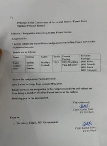 भोपाल। मध्य प्रदेश में भारतीय वन सेवा के एक युवा अधिकारी ने अपनी सेवा से त्यागपत्र दे दिया है, जिससे प्रशासनिक हलकों में चर्चा शुरू हो गई है। राज्य कैडर के 2013 बैच के IFS अधिकारी विपिन कुमार पटेल ने अपना बिना शर्त इस्तीफा प्रधान मुख्य वन संरक्षक (PCCF) एवं वन बल प्रमुख, मध्य प्रदेश को सौंप दिया है।