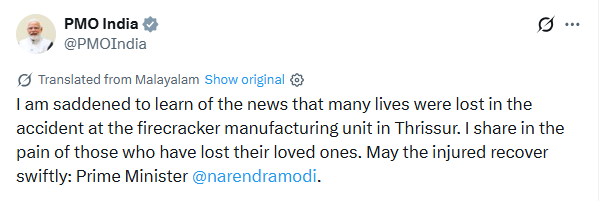 वहीं प्रधानमंत्री नरेंद्र मोदी ने भी इस घटना पर दुख व्यक्त किया है। उन्होंने कहा कि केरलम के त्रिशूर में एक पटाखा फैक्ट्री में हुए हादसे में लोगों की मौत की खबर सुनकर बहुत दुख हुआ। जिन लोगों ने अपने प्रियजनों को खोया है, उनके प्रति मेरी गहरी संवेदना है। घायल लोग जल्द से जल्द ठीक हो जाएं। प्रधानमंत्री ने घोषणा की है कि हर मृतक के परिवार को 2 लाख रुपये की मदद दी जाएगी। घायलों को 50,000 रुपये दिए जाएंगे।