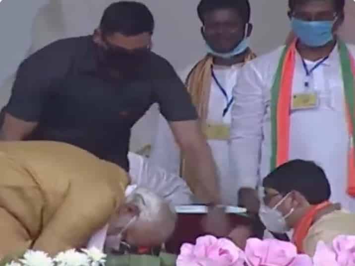 पश्चिम बंगाल में चुनावी रैली के दौरान मंच पर जब एक भाजपा कार्यकर्ता पैर छूने आया, तो पीएम श्री @narendramodi ने भी पैर छूकर कार्यकर्ता का अभिवादन किया।#BanglarUnnotiteBJPChai pic.twitter.com/QDGSKNqbBb
