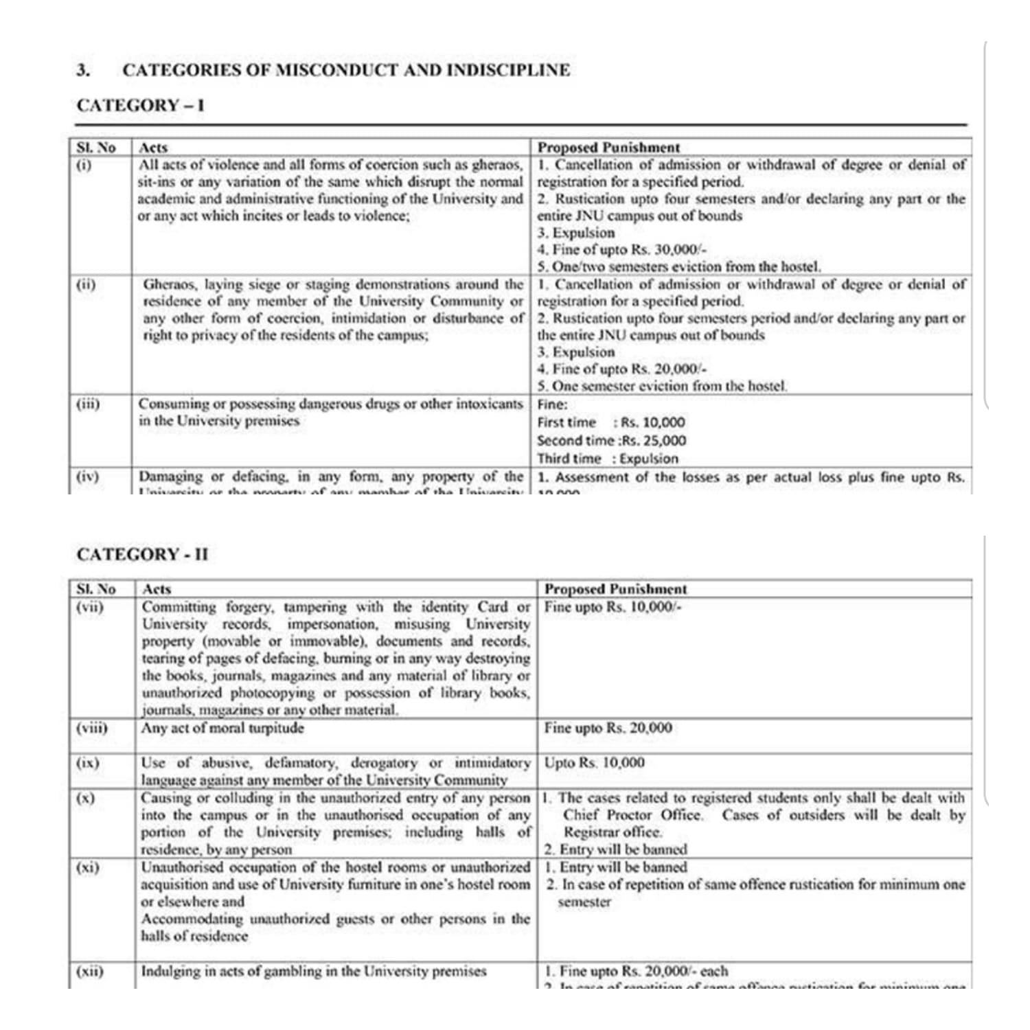 ये नियम 3 फरवरी से लागू किए गए हैं और दस्तावेज में कहा गया है कि इसे इसे कार्यकारी परिषद ने स्वीकृति दी है। जेएनयू में निर्णय लेने वाला ये सर्वोच्च निकाय है। विश्वविद्यालय के नए नियमों के अनुसार अगर छात्र परिसर में धरना देते हैं या भूख हड़ताल करते हैं तो उनके ऊपर 20,000 रुपये का जुर्माना लगाया जाएगा। किसी भी तरह की हिंसा करने पर उनका दाखिला रद्द किया जा सकता है अथवा 30,000 का जुर्माना लगाया जा सकता है। इस प्रकार विश्वविद्यालय ने 17 अपराधों के लिए दंड सूचीबद्ध किए हैं।