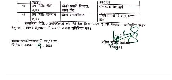 - निरीक्षक राजेश शाह को प्रभारी निरीक्षक कोतवाली डालनवाला से प्रभारी निरीक्षक कोतवाली नगर भेजा गया है।