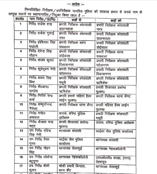 - निरीक्षक सूर्य भूषण नेगी को प्रभारी निरीक्षक कोतवाली पटेल नगर से प्रभारी निरीक्षक कोतवाली विकास नगर ।निरीक्षक शंकर सिंह बिष्ट को प्रभारी निरीक्षक कोतवाली मसूरी से प्रभारी निरीक्षक कोतवाली ऋषिकेश ।
