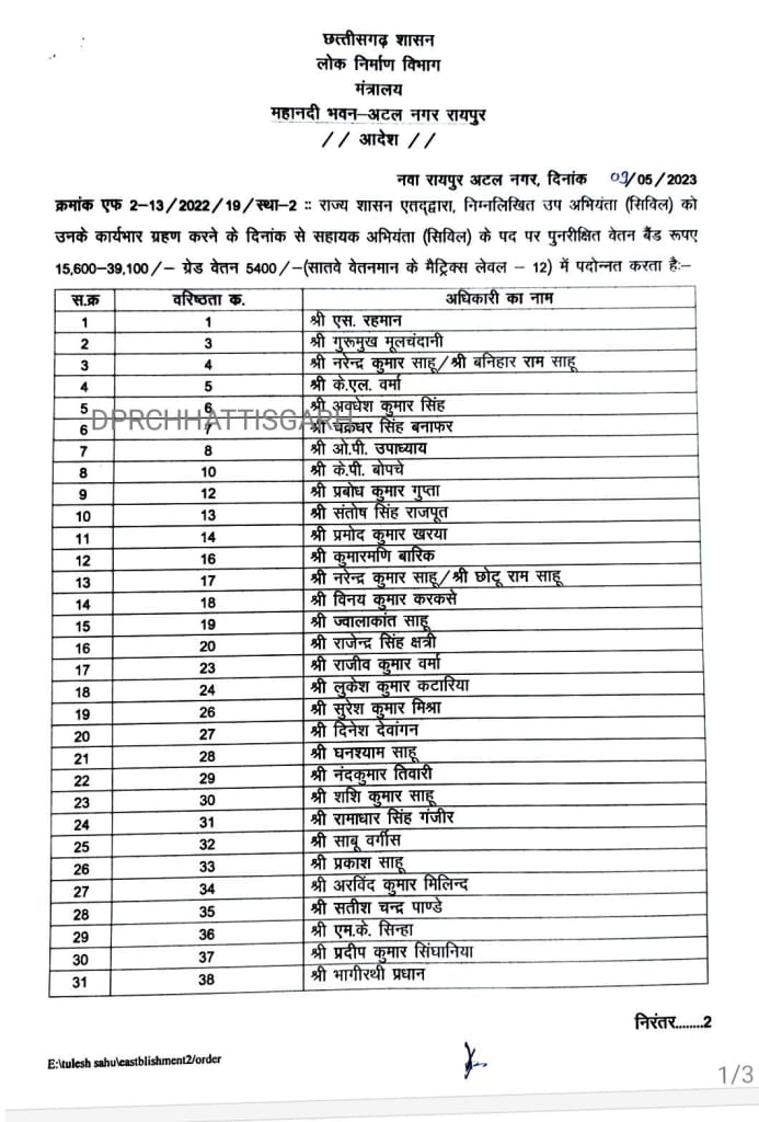 लोक निर्माण विभाग, छत्तीसगढ़ द्वारा जारी किए गए। आदेश के तहत कुल 39 अभियंताओं सिविल को सहायक अभियंता सिविल के पद पर पदोन्नति दी गई है। इसके लिए आदेश भी जारी कर दिए गए हैं। वहीं सहायक अभियंता के पद पर पुनरीक्षित वेतन पे बैंड 15600-39100 के तहत ग्रेड वेतन 5000, सातवें वेतनमान के मैट्रिक्स लेवल 12 पर पदोन्नति दी गई है।