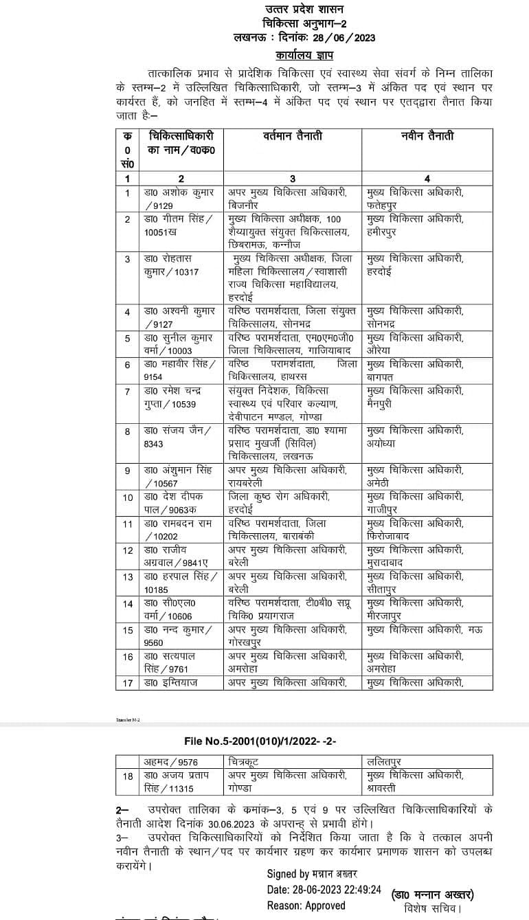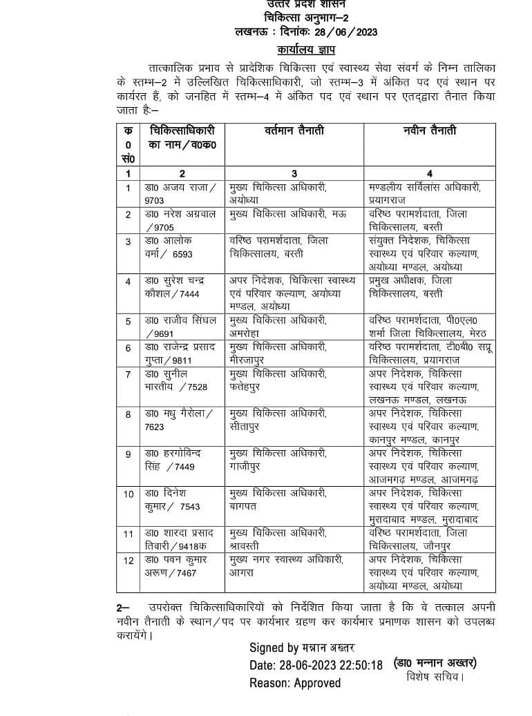 - जबकि अश्वनी कुमार को मुख्य चिकित्सा अधिकारी सोनभद्र नियुक्त किया गया