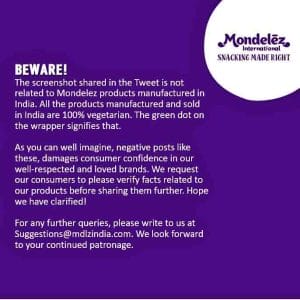 हालांकि यह पहली बार नहीं हुआ जब इस स्क्रीनशॉट के साथ कैडबरी के बायकाट की बात की गई हो। इस स्क्रीनशॉट को वर्ष 2021 के जुलाई में भी ट्विटर पर वायरल किया गया था और कैडबरी के बायकाट की बात की गई थी। जिसके बाद कैडबरी इंडिया ने एक स्टेटमेंट जारी कर इन सभी बातों का खंडन किया था। कैडबरी की पैरंट कंपनी मोंडेलेज ने लिखा था कि “कैडबरी का जो स्क्रीनशॉट भारत में टि्वटर पर वायरल हो रहा है वह स्क्रीनशॉट भारत में बने उत्पादों का नहीं है। भारत में जो भी उत्पाद बनाए जाते हैं वह 100% शाकाहारी हैं। और उत्पाद के व्यापार पर बना हुआ ग्रीन डॉट इस बात की पुष्टि करता है। आप लोग सोच सकते हैं कि इस तरह के नेगेटिव पोस्ट हमारे प्रोडक्ट और हमारे प्रति लोगों के विश्वास को नुकसान पहुंचाते हैं। हम उम्मीद करते हैं कि सभी लोग इस तरह की बातों पर विश्वास करने से पहले बात की सच्चाई तक जरूर पहुंचे। हमें हमने बेहतर तरीके से अपनी बात आप सभी के सामने रखी है।”