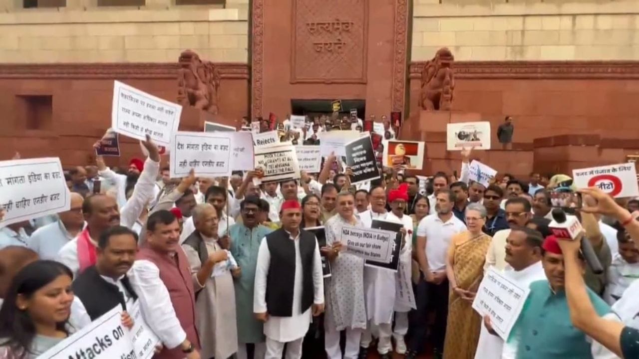 INDIA के सांसदों ने संसद के बाहर बजट के विरोध में प्रदर्शन किया