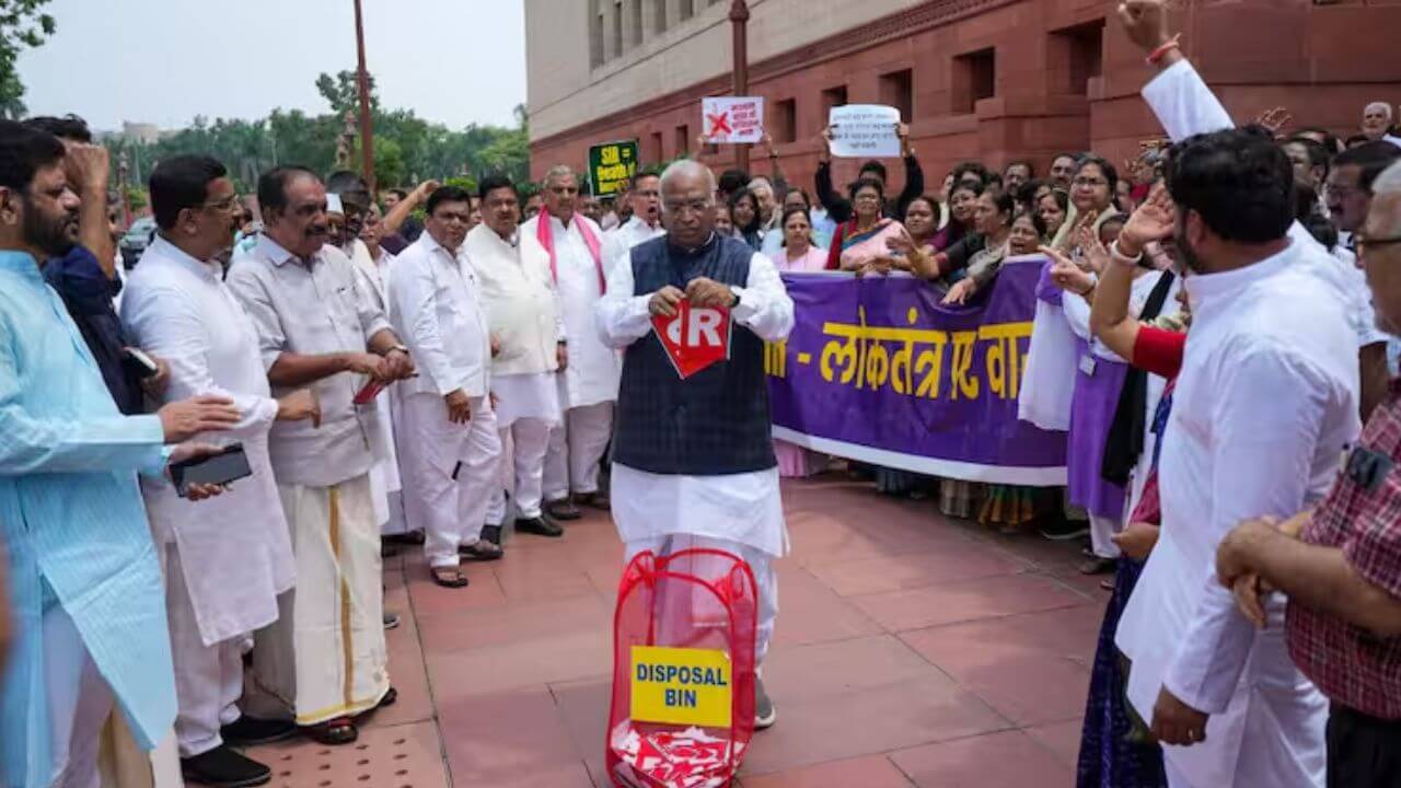 विपक्षी नेताओं ने प्रतीकात्मक विरोध के तहत एक कूड़ेदान रखा और उसमें एसआईआर लिखे पोस्टर फाड़कर डाले। खरगे और राहुल गांधी सहित कई सांसदों ने इस प्रतीकात्मक कार्रवाई में हिस्सा लिया। विपक्ष ने मांग की कि इस मुद्दे पर संसद में तत्काल चर्चा होनी चाहिए, क्योंकि यह लोकतंत्र के लिए खतरा है।