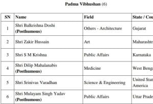 आर्किटेक्चर के लिए गुजरात के श्री बालकृष्ण दोशी, आर्ट के लिए महाराष्ट्र के श्री जाकिर हुसैन, पब्लिक अफेयर्स के लिए कर्नाटक के श्री एस एम कृष्णा, साइंस और इंजीनियरिंग के लिए USA के श्री श्रीनिवास वरधान, मेडिसिन के लिए वेस्ट बंगाल के श्री दिलीप महालनबिस और पब्लिक अफेयर्स के लिए श्री मुलायम सिंह यादव को पद्म विभूषण से सम्मानित किया किया जाएगा।