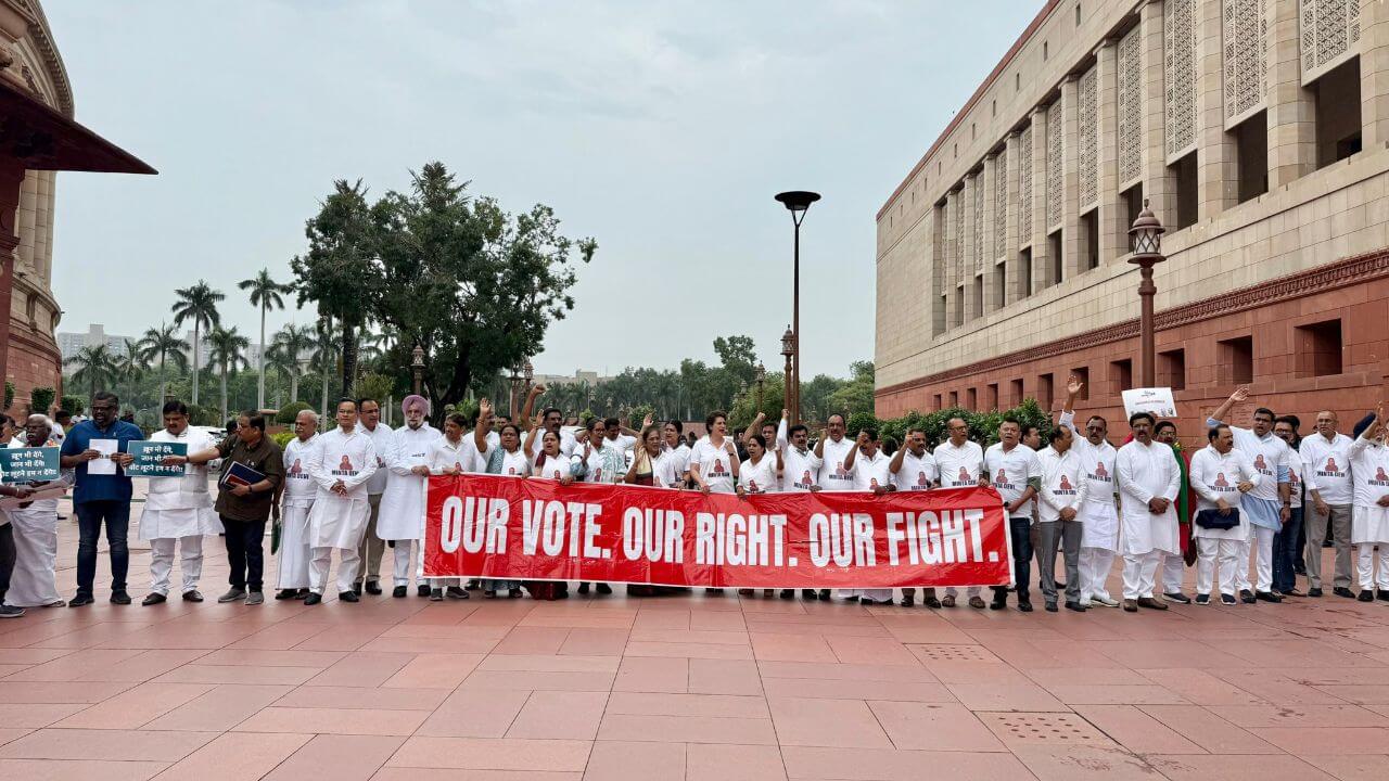 सांसद, वोट चोर गद्दी छोड़ के नारे लगा रहे थे, उनके सामने एक बड़ा सा पोस्टर था, जिसपर लिखा था वोट चोरी बंद करो, Our Vote… Our Right… Our Fight… प्रदर्शन के दौरान विपक्षी दल एक सांसद चुनाव आयोग और भाजपा सरकार पर आरोपों की बौछार कर रहे थे।