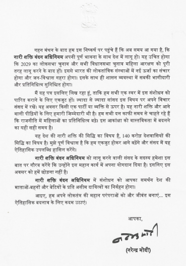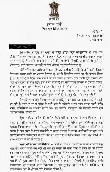 पत्र में पीएम मोदी ने लिखा है कि 16 अप्रैल से देश की संसद में ‘नारी शक्ति वंदन अधिनियम’ से जुड़ी एक महत्वपूर्ण चर्चा होने जा रही है। उन्होंने इसे लोकतंत्र को मजबूत बनाने और ‘सबको साथ लेकर चलने’ की प्रतिबद्धता दोहराने का अवसर बताया। प्रधानमंत्री ने कहा कि इसी भावना और उद्देश्य के साथ उन्होंने सभी सांसदों को यह पत्र लिखा है, जिसमें उन्होंने देश के भविष्य के लिए इस कानून के महत्व पर जोर दिया है।