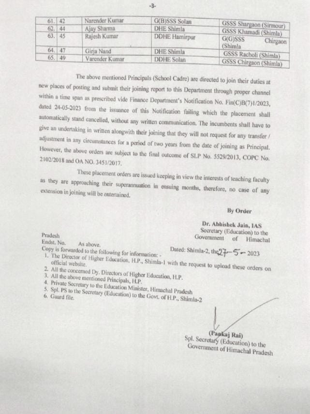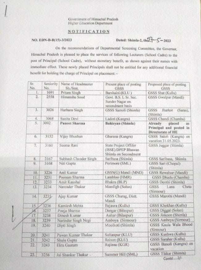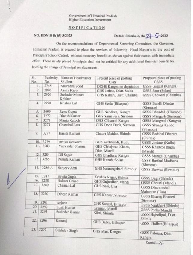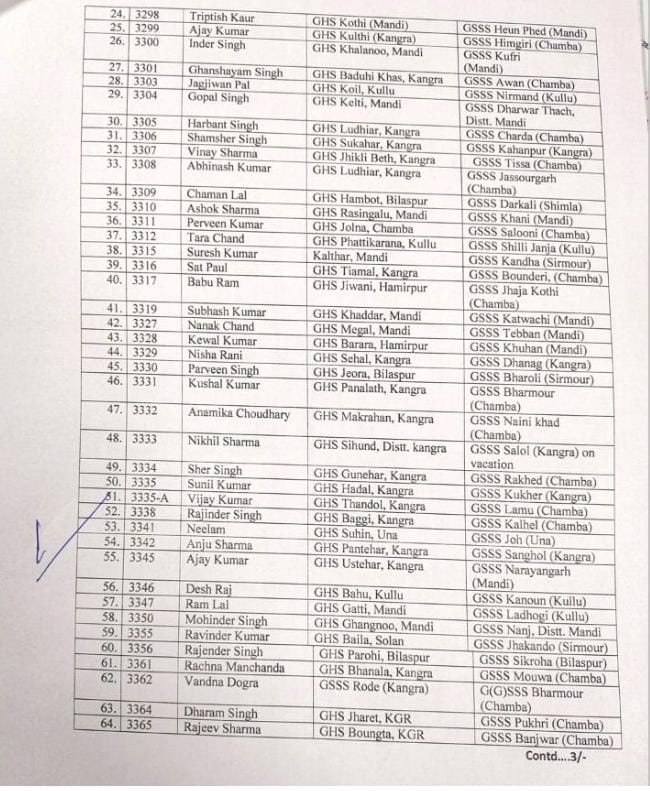 हिमाचल प्रदेश में विभागीय स्क्रीनिंग कमेटी की सिफारिश के बाद यह सूची जारी की गई है। वहीं नवनियुक्त कर्मचारी को प्रभार धारण करने के निर्देश दिए गए हैं। हालांकि प्रभार धारण करने के साथ ही इसकी जानकारी विभाग को उपलब्ध करानी होगी। वही कर्मचारियों को किसी भी तरह के अतिरिक्त वित्तीय लाभ उपलब्ध नहीं कराए जाएंगे।