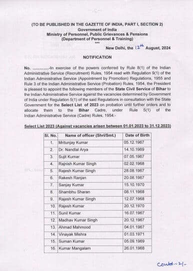 Bihar Officers Promotion: 15 अगस्त से पहले बिहार प्रशासनिक सेवा के 20 अधिकारियों को तोहफा मिला है। राज्य की नीतीश कुमार सरकार ने 20 प्रशासनिक सेवा अफसरों को भारतीय प्रशासनिक सेवा के अधिकारी के रूप में प्रोन्नति दी है। केंद्र सरकार के कार्मिक, लोक शिकायत व पेंशन मंत्रालय ने सोमवार को प्रोन्नत अधिकारियों की सूची जारी की। बिहार के ये सभी अधिकारी 39वें बैच के हैं। इन अधिकारियों की पहली तैनाती संयुक्त सचिव के रूप में होगी।