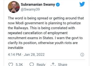 वही वरुण गांधी के बाद सुब्रमण्यम स्वामी ने ट्वीट कर सरकार को आईना दिखाते हुए लिखा-‘बात फैलाई जा रही है या इधर-उधर हो रही है कि अब मोदी सरकार रेलवे का निजीकरण करने की योजना बना रही है। इसे राज्यों में रोजगार भर्ती परीक्षाओं को बार-बार रद्द करने के साथ जोड़ा जा रहा है। मैं सरकार को अपनी स्थिति स्पष्ट करने की चेतावनी देता हूं अन्यथा युवाओं का उपद्रव होना ही है।’
