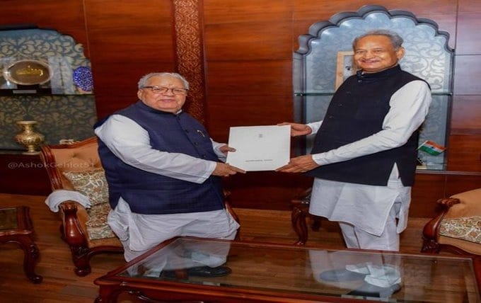 हार स्वीकार करने के बाद राजस्थान के मुख्यमंत्री अशोक गहलोत ने रविवार शाम जयपुर के राजभवन में राज्यपाल कलराज मिश्र को अपना इस्तीफा सौंप दिया है। राज्यपाल ने गहलोत का पद से इस्तीफा स्वीकार कर लिया है और नई सरकार बनने तक उन्हें अपनी जिम्मेदारी निभाने को कहा है।