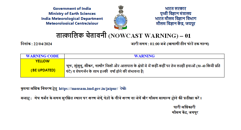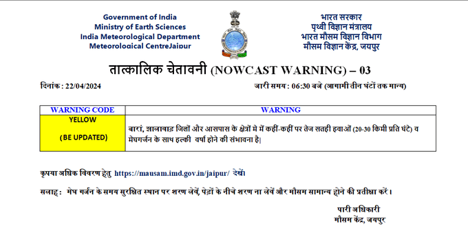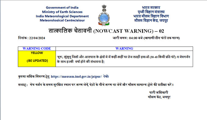 राजस्थान मौसम विभाग के मुताबिक, आज 22 अप्रैल को बीकानेर व जयपुर संभाग के उत्तरी-भागों में आंधी व बारिश की संभावना है।इस दौरान 30 से 40 किमी प्रति घंटे की स्पीड से हवाएं चल सकती है। अजमेर व बीकानेर संभाग में तापमान सामान्य से कम रहने और जयपुर, कोटा, उदयपुर तथा जोधपुर संभाग में सामान्य रहने अनुमान है। तीन चार दिन बाद तापमान में बढ़ोतरी होने की संभावना है।