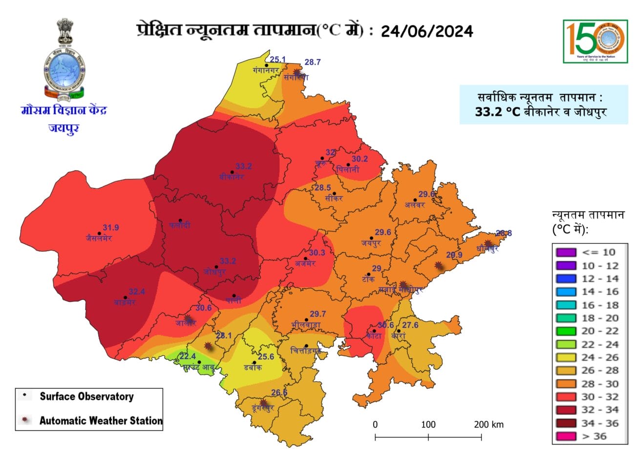 - राजस्थान मौसम विभाग के मुताबिक, आने वाले कुछ दिनों तक दक्षिणी और दक्षिण पूर्वी राजस्थान के जोधपुर, अजमेर, कोटा, उदयपुर संभाग के कुछ हिस्सों में प्री मानसून की गतिविधियां जारी रहेगी। 24-25 जून को उदयपुर-कोटा संभाग में बारिश का असर देखने को मिलेगा।