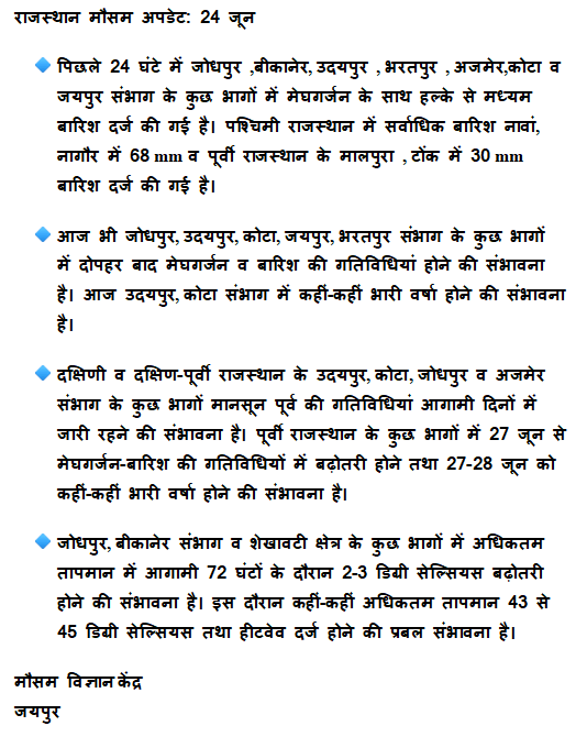 - 25 जून से पूर्वी राजस्थान के कुछ हिस्सों में बिजली चमकने के साथ तेज बारिश और 26-27 जून को कुछ जगहों पर झमाझम बारिश का अलर्ट भी जारी किया गया है।