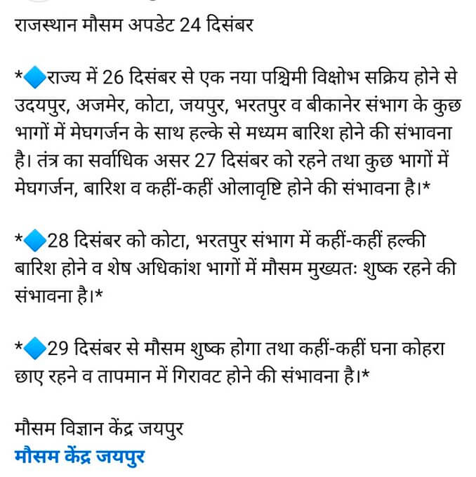 26-27 दिसंबर को प्रदेश में मेघगर्जन, बारिश व कहीं-कहीं ओलावृष्टि होने का अनुमान है। 28 दिसंबर को कोटा, भरतपुर संभाग में कहीं-कहीं हल्की बारिश होने व शेष अधिकांश भागों में मौसम मुख्यतः शुष्क रहने की संभावना है। 29 दिसंबर से मौसम शुष्क होगा तथा कहीं-कहीं घना कोहरा छाए रहने व तापमान में गिरावट होने की संभावना है।
