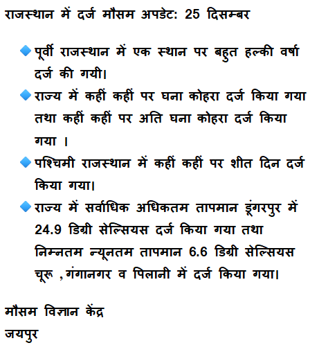 - 27 दिसंबर को पश्चिमी विक्षोभ के असर से अजमेर, अलवर, भीलवाड़ा, बूंदी, चित्तोड़गढ़, दौसा, राजसमंद, सवाई माधोपुर, सीकर, टोंक, उदयपुर, नागौर और पाली में ओलावृष्टि की चेतावनी जारी की गई है।
