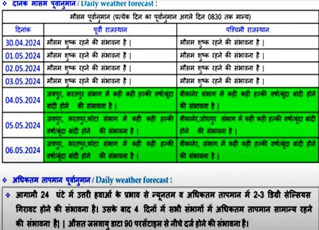- 4-5 मई के बीच जयपुर, कोटा, भरतपुर, जोधपुर और बीकानेर संभाग में हल्की वर्षा की संभावना है। बीकानेर, चूरू, हनुमानगढ़, गंगानगर, जैसलमेर, फलौदी के कुछ इलाकों में बादल छाने के साथ ही हल्की बारिश या बूंदाबांदी और धूलभरी आंधी चल सकती है।
