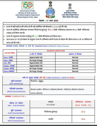 - सर्वाधिक अधिकतम तापमान चित्तौड़गढ़ व डूंगरपुर में 35.3 डिग्री (सामान्य से 2.2 डिग्री सेल्सियस ज्यादा) दर्ज किया गया है।