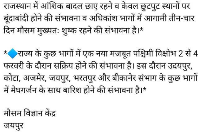 2 से 4 फरवरी के दौरान एक मजबूत पश्चिमी विक्षोभ सक्रिय होगा, इसके असर से उदयपुर, कोटा, अजमेर, जयपुर, भरतपुर और बीकानेर संभाग के कुछ भागों में बादलों की गरज के साथ बारिश होने की संभावना है।