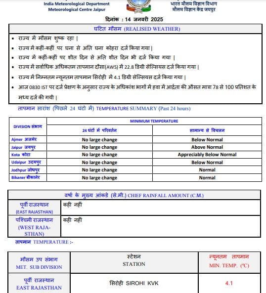 15 जनवरी बुधवार को बीकानेर, जयपुर, भरतपुर अजमेर, कोटा संभागों में मेघगर्जन के साथ कहीं-कहीं हल्की से मध्यम बारिश संभावना है। बीकानेर, चूरू, हनुमानगढ़ और नागौर, जयपुर, झुंझुनूं, सीकर, दौसा, धौलपुर, अलवर और भरतपुर में भी बारिश के साथ कहीं कहीं ओलावृष्टि के आसार है।बारिश से सरसों, चना ,गेहूं ,जौ आदि फसलों को लाभ मिलेगा,अब सरसों को सिंचाई की आवश्यकता नहीं है।