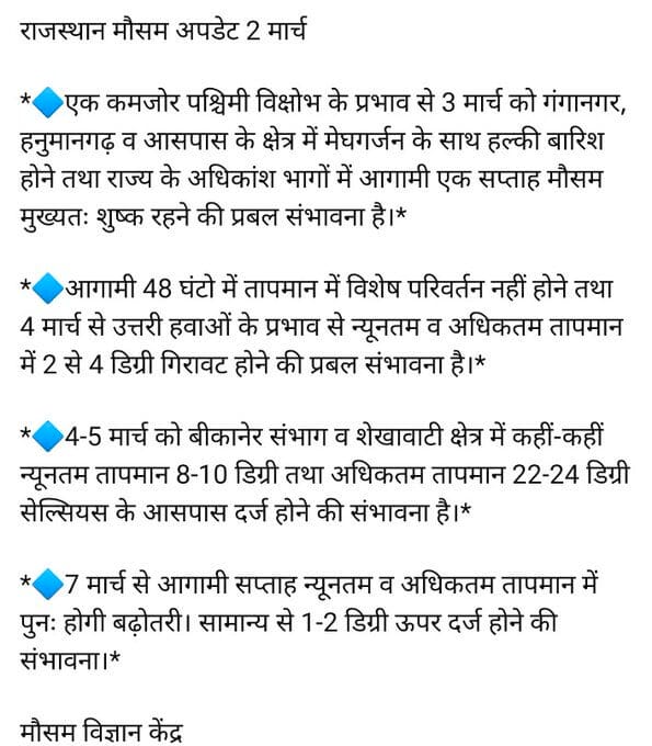 मौसम केंद्र जयपुर की रिपोर्ट के मुताबिक आज 3 मार्च को गंगानगर, हनुमानगढ़ व आसपास के क्षेत्र में मेघगर्जन, हल्की बारिश तथा अधिकांश भागों में आगामी 1 सप्ताह मौसम शुष्क रहेगा।3-4 दिन तक दिन रात के तापमान में उतार चढ़ाव का दौर जारी रहेगा। रविवार को पूर्वी राजस्थान में मौसम मुख्यत शुष्क रहा तथा पश्चिमी राजस्थान में कही कही पर बूंदा-बांदी हुई।सर्वाधिक अधिकतम तापमान भीलवाडा में 34.3 सेल्सियस तो न्यूनतम तापमान सांगरिया (KVK) में 10.1 डिग्री सेल्सियस दर्ज किया गया |