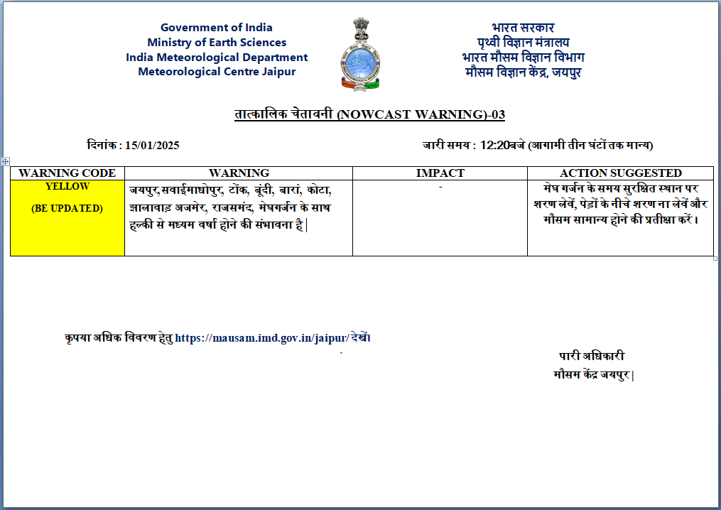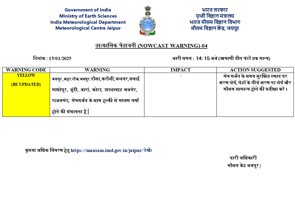 - बुधवार अजमेर, अलवर, बारां, भरतपुर, भीलवाड़ा, बूंदी, चित्तौड़गढ, दौसा, धौलपुर, जयपुर, झालावाड़, झुंझुनूं, करौली, कोटा, सवाई माधोपुर, सीकर और टोंक में बारिश की चेतावनी जारी की गई है।