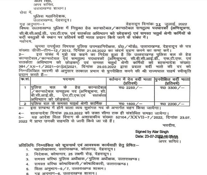 अपर सचिव गृह अतर सिंह की ओर से जारी आदेश के मुताबिक, वर्दी भत्ते का लाभ इसी वर्ष 29 मार्च 2022 से देय होगा यानि 5 महीने का एरियर भी दिया जाएगा। इसका लाभ 25 हजार कर्मचारियों को मिलेगा। इसके तहत उत्तराखंड पुलिस में नियुक्त हेट कांस्टेबल, कांस्टेबल, समतुल्य पदधारकों को (अभिसूचना,BCCID, STF एवं सतर्कता अनुष्ठान को छोड़कर) एवं समस्त चतुर्थ श्रेणी कर्मियों के वर्दी वस्तुओं के स्थान पर प्रतिवर्ष वर्दी भत्ते की दर को बढ़ा दिया गया है।