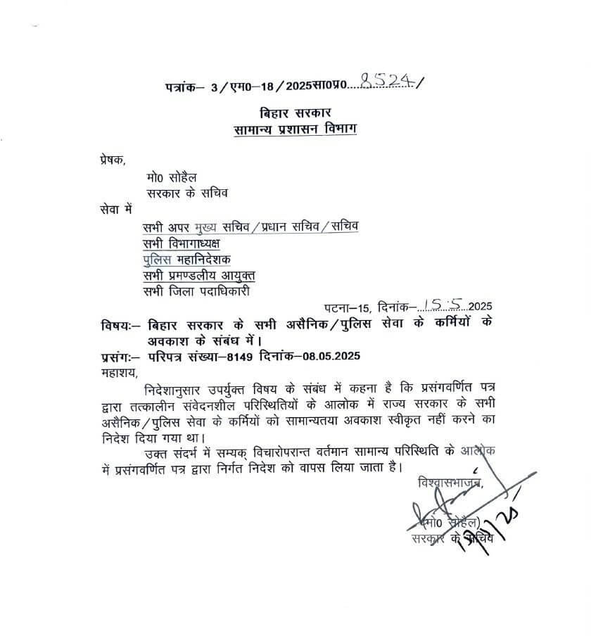 दरअसल, बीते दिनों बिहार सरकार ने भारत पाक तनाव के चलते पुलिसकर्मियों, पुलिस पदाधिकारियों और सभी सरकारी अधिकारियों से साथ साथ सभी कर्मियों की छुट्टियां रद्द कर दी थी। संवेदनशील परिस्थितियों को ध्यान में रखते हुए कर्मचारियों की छुट्टी को मंजूरी नहीं करने के निर्देश जारी किया गए थे। केवल विशेष परिस्थितियों में छुट्टी का आवेदन स्वीकार करने की बात कहीं गई थी हालांकि अब हालात सामान्य होने पर बिहार सरकार उस आदेश को रद्द कर दिया है।